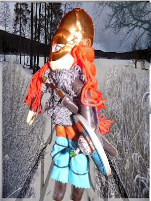 La mia Svala ha una grossa treccia di capelli realizzati con lana rossa e non potevano mancare l'elmo, lo scudo e la spada